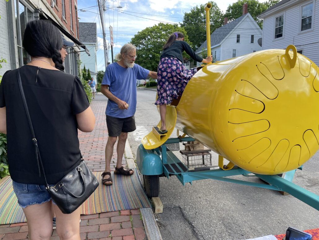 Yellow Submarine with Jim Doble: Instrument maker Jim Doble (blue shirt) brought his Yellow Submarine, played from the inside, to Wiscasset Art Walk in June. Jim will be making a raw log Amadinda for visitors to play during the July 28 Art Walk, 5-8pm. (Wiscasset Art Walk photo)