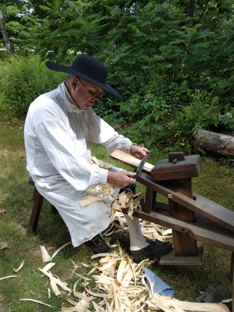 Peter Morrissey makes shingles on a shaving horse. Re-enactors will accompany the shape note singing workshop.
