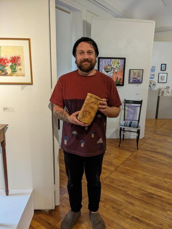 Emerging artist Max Miller of Thomaston is a carpenter by day, artist by night. Miller got his start in wood turning during the pandemic when he received a lathe as a birthday gift. His relentless progression to hone and evolve his craft is visible on his Facebook page. Several of his pieces are displayed in this show and, beginning in January, at the Center for Furniture Craftsmanship in Rockport.