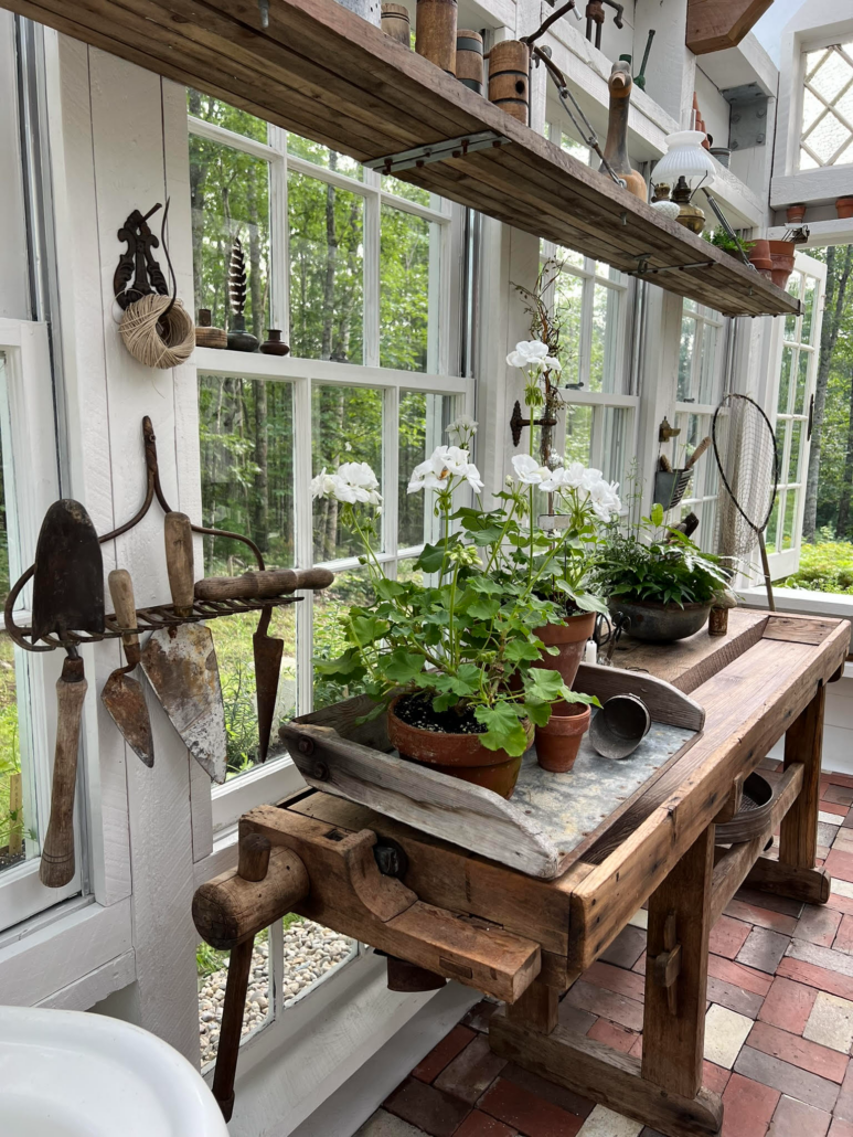 Two of the gardens have been featured in Down East magazine, and all are bound to provide elements to spark the imagination of local gardeners. One woodland garden includes more than 230 varieties of hosta, a stumpery, and an Asian garden. Another garden has a delightful potting shed made from vintage windows. A beautiful old work table stands on a brick floor, and a wrought iron chandelier provides a touch of whimsy.