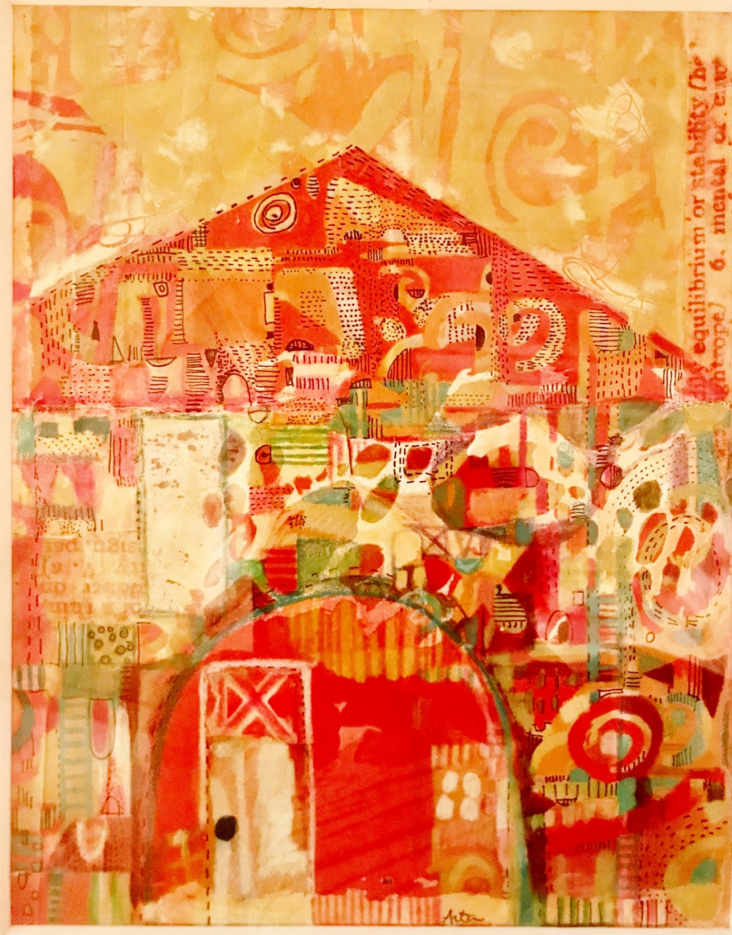 (photo caption)”Equilibrium” by Debra Arter, a bright and energetic mixed media work of art by Debra Arter is included in the Maine Art Gallery Members Show.