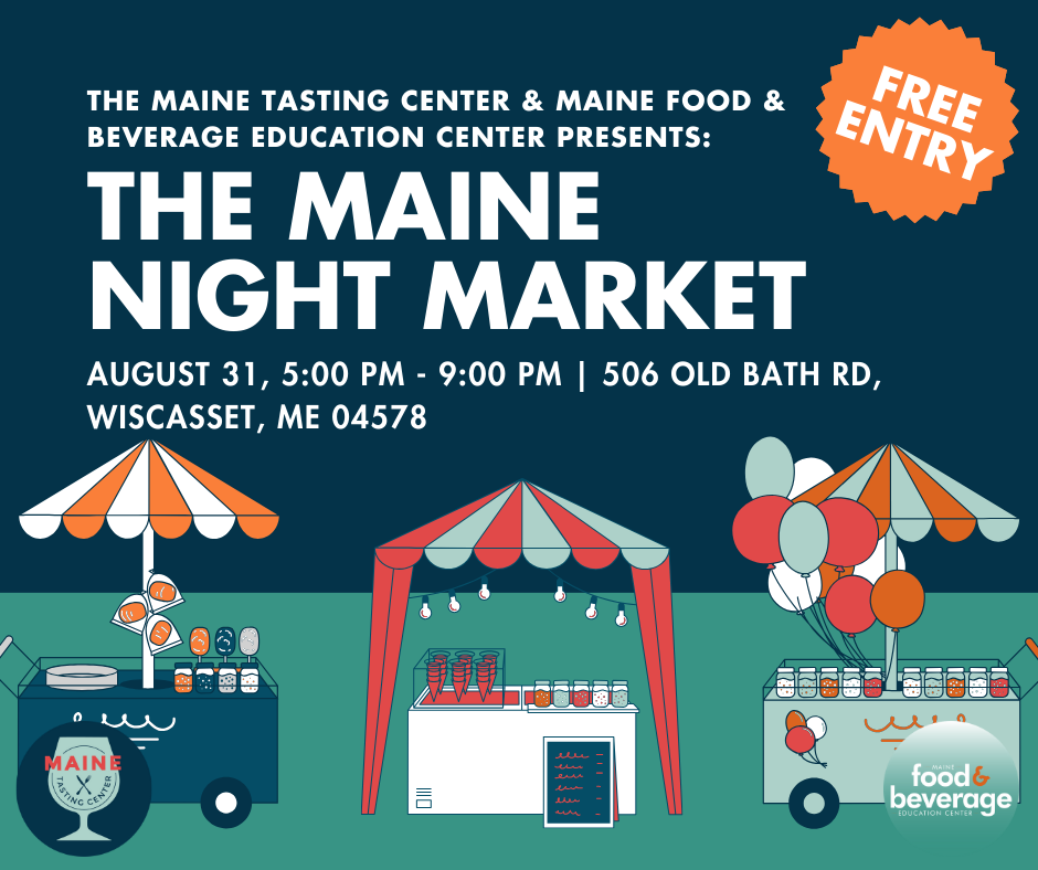 Maine Night Market Graphic: The inaugural Maine Night Market event will take place at Maine Tasting Center in Wiscasset on August 31 from 5 – 9 PM with free admission and parking.