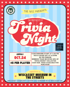 Come out Friday, October 24th for a battle of the brains at this months WCC’s non-profit trivia night!Help Wiscasset Museum in the Streets raise money for a new information panel, while having a fun night out. $5 per person, teams no larger than 8. Winning team receives 50% of the trivia pot! There will be dinner available for purchase along with a cash bar.