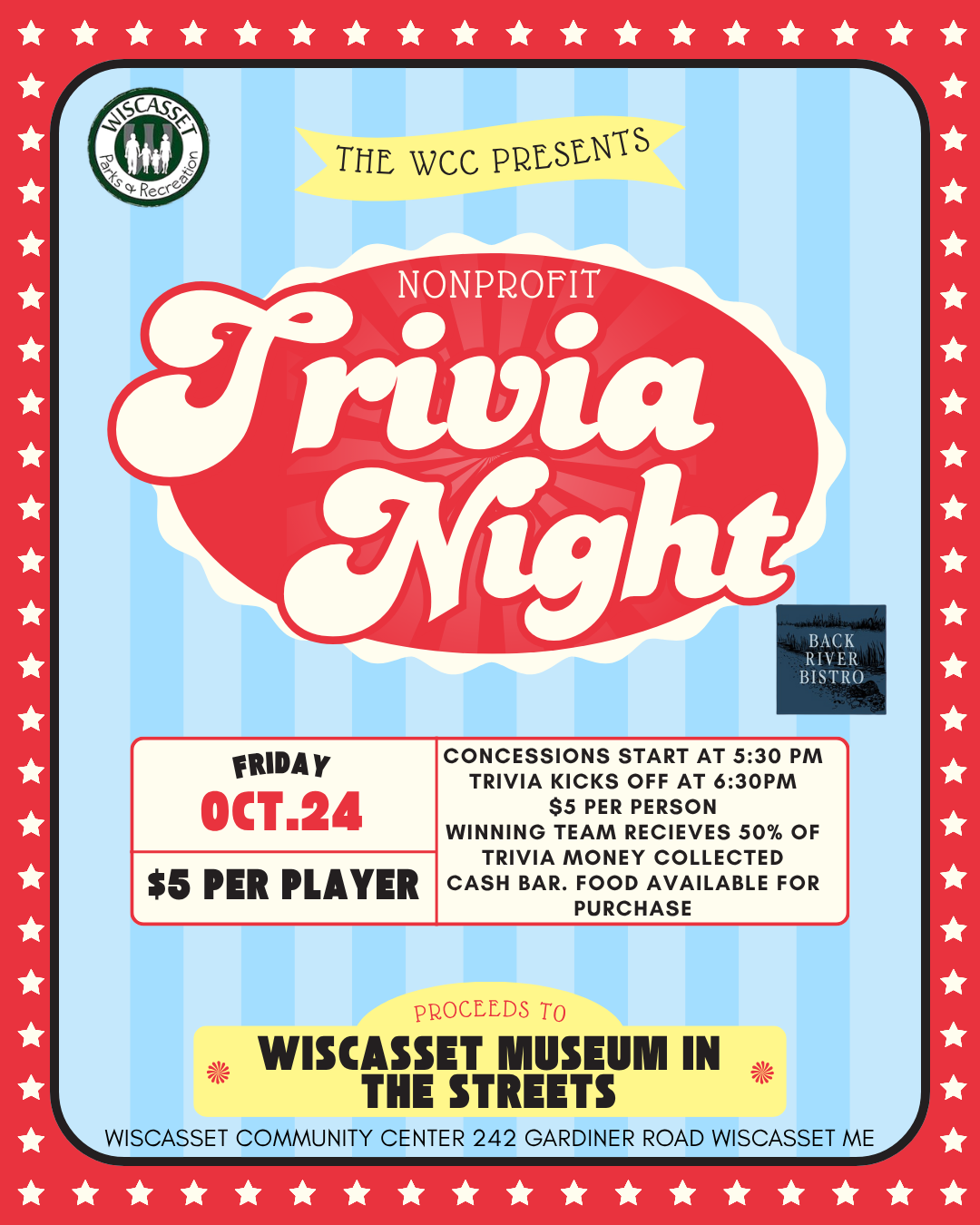 Wiscasset Community Center 242 Gardiner Road, Wiscasset, MaineCome out Friday, October 24th for a battle of the brains at this months WCC's non-profit trivia night! Help Wiscasset Museum in the Streets raise money for a new information...